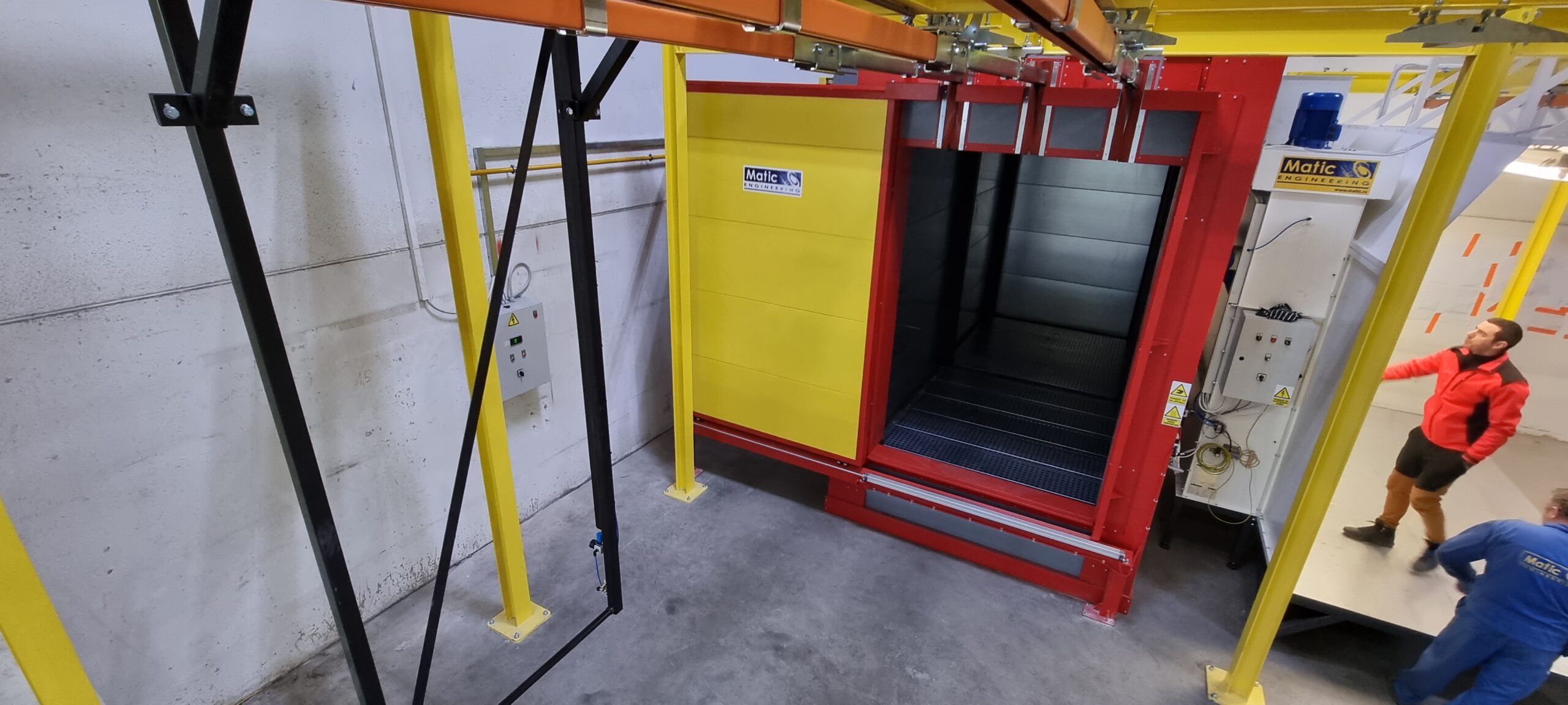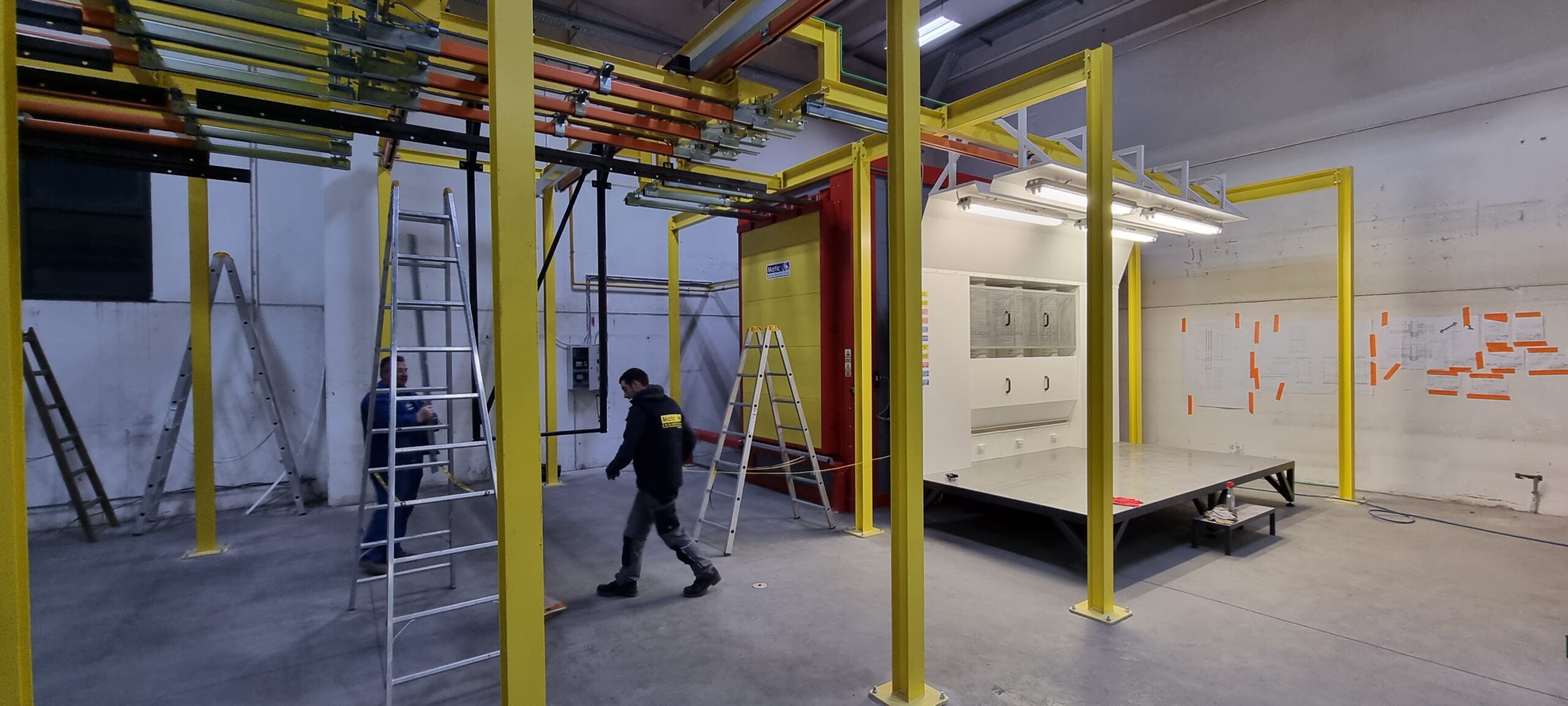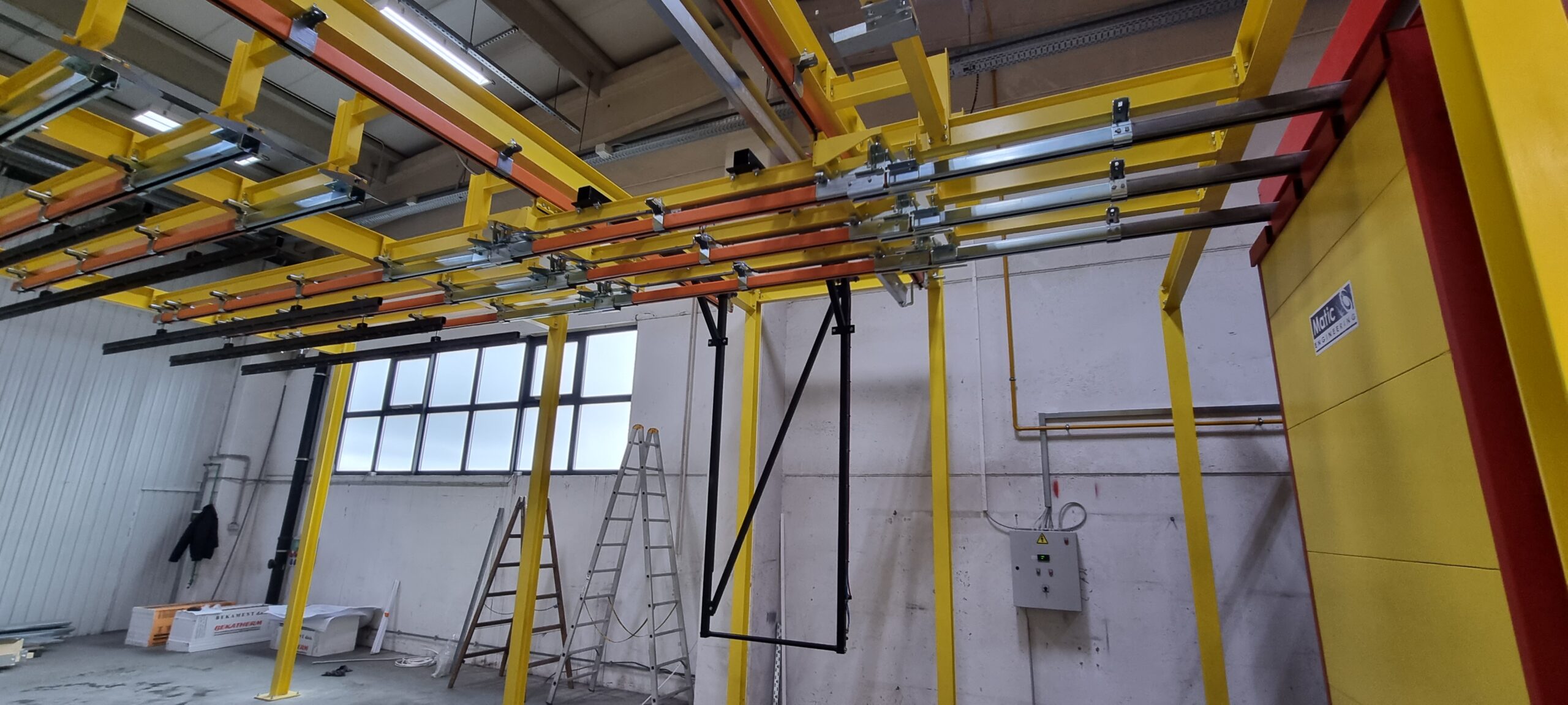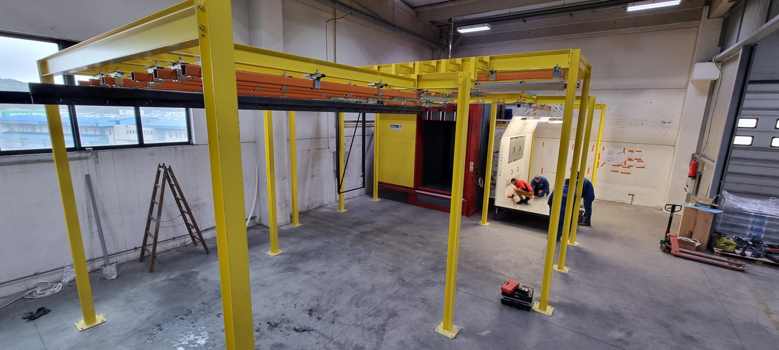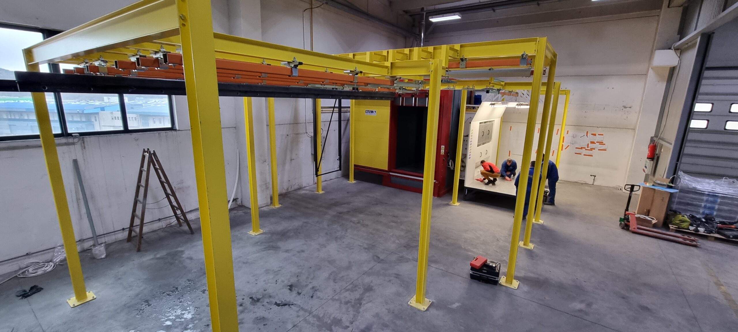 Ručno postrojenje za elektrostatičko farbanje prahom. Peć za polimerizaciju na priordni gas sa maksimalnim mogućim dimenzijama radnog komada od 4500 x 2000 x 1600 mm. WAGNER Basic 8000 kabina za farbanje bez rekuperacije praha i uređaj za farbanje WAGNER PRIMA Sprint X AirFluid. Sve celine objedinjuje ručni šaržni trasnportni sistem sa translatornim i linijskim kretanjem. Šaržer se kontroliše komprimovanim vazduhom i pomoću pneumatskih zabravljivača se pozicionira na željenje pozicije. Maksimalna nosivost jedne nosiljke je 300 kg. Proizvođač transporta je Railtehniek GmbH iz Holandije.