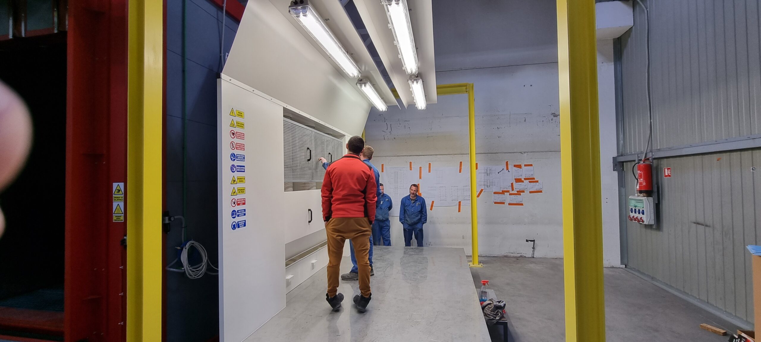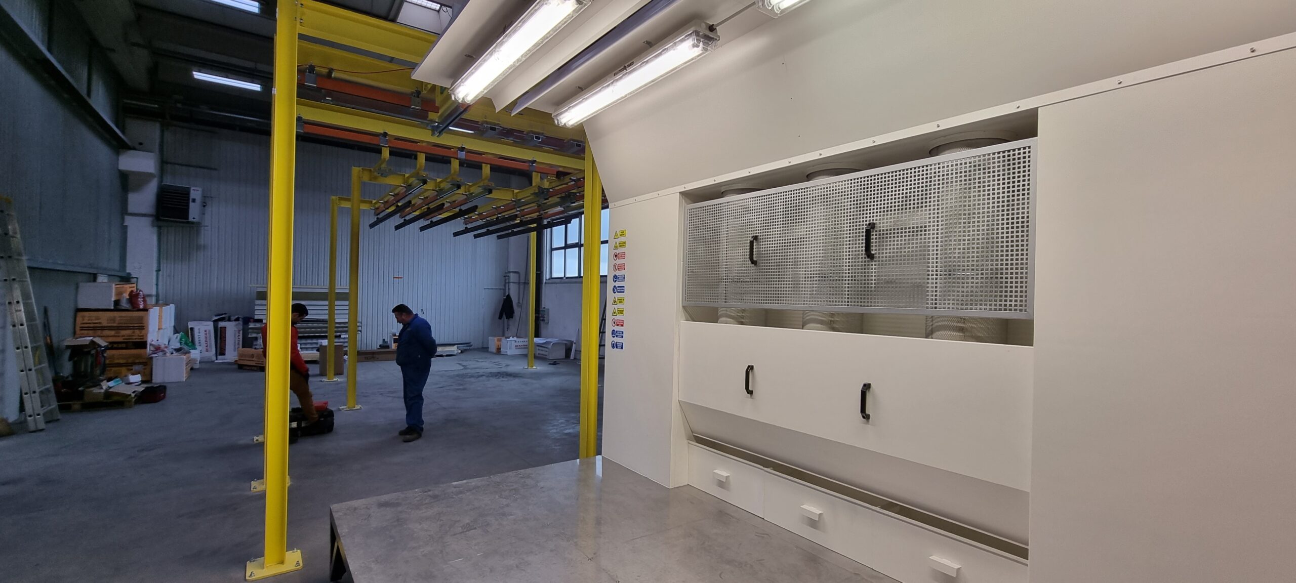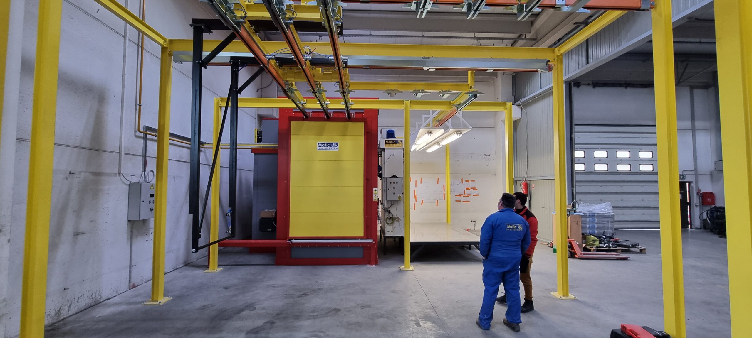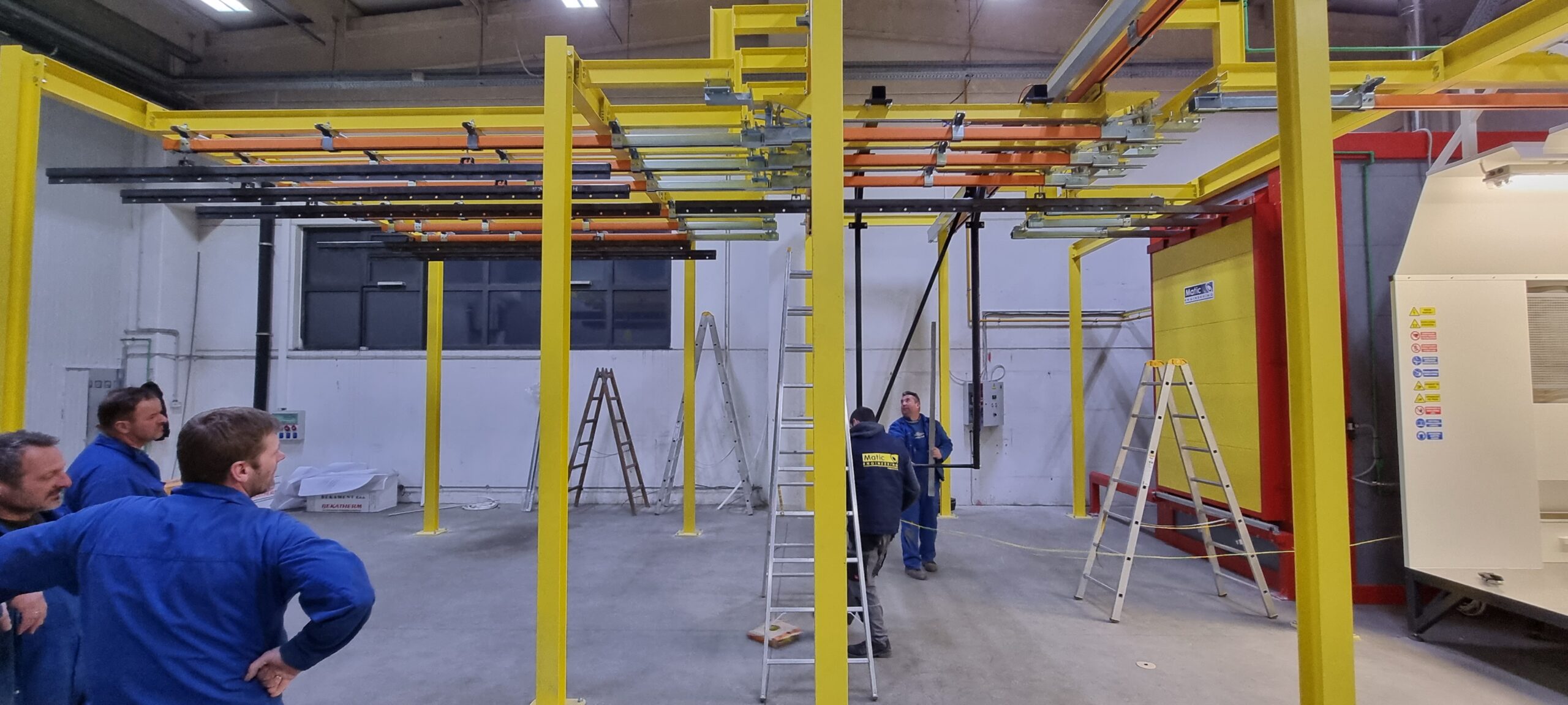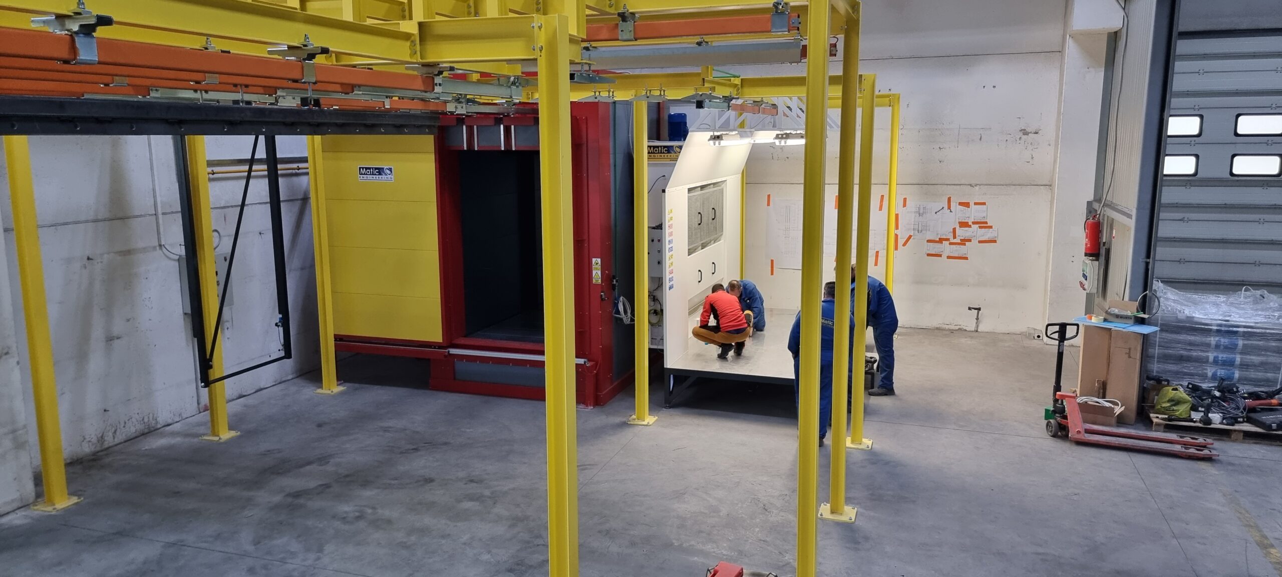 Ručno postrojenje za elektrostatičko farbanje prahom. Peć za polimerizaciju na priordni gas sa maksimalnim mogućim dimenzijama radnog komada od 4500 x 2000 x 1600 mm. WAGNER Basic 8000 kabina za farbanje bez rekuperacije praha i uređaj za farbanje WAGNER PRIMA Sprint X AirFluid. Sve celine objedinjuje ručni šaržni trasnportni sistem sa translatornim i linijskim kretanjem. Šaržer se kontroliše komprimovanim vazduhom i pomoću pneumatskih zabravljivača se pozicionira na željenje pozicije. Maksimalna nosivost jedne nosiljke je 300 kg. Proizvođač transporta je Railtehniek GmbH iz Holandije.