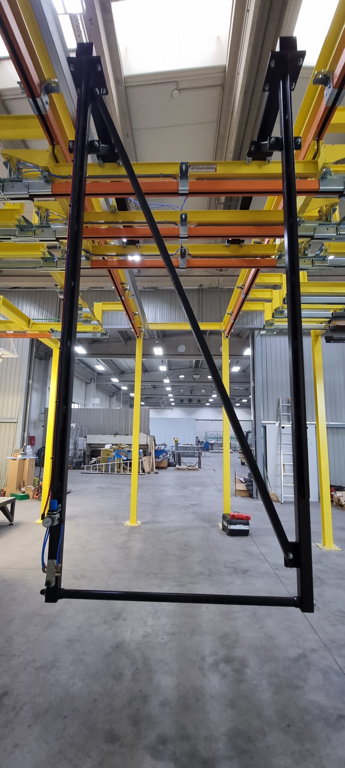 Manual plant for electrostatic powder painting. Furnace for polymerization on natural gas with the maximum possible dimensions of the work piece of 4500 x 2000 x 1600 mm. WAGNER Basic 8000 painting booth without powder recovery and WAGNER PRIMA Sprint X AirFluid painting device. All units are united by a manual batch transport system with translational and linear movement. The charger is controlled by compressed air and positioned to the desired position by means of pneumatic locks. The maximum carrying capacity of one stretcher is 300 kg. The transport manufacturer is Railtehniek GmbH from the Netherlands.