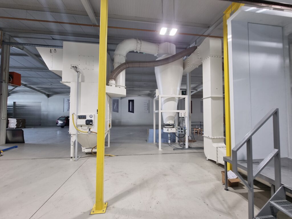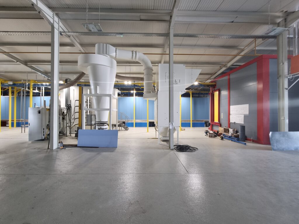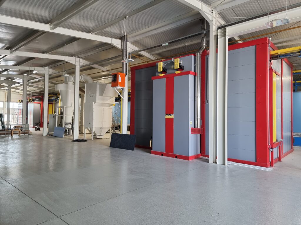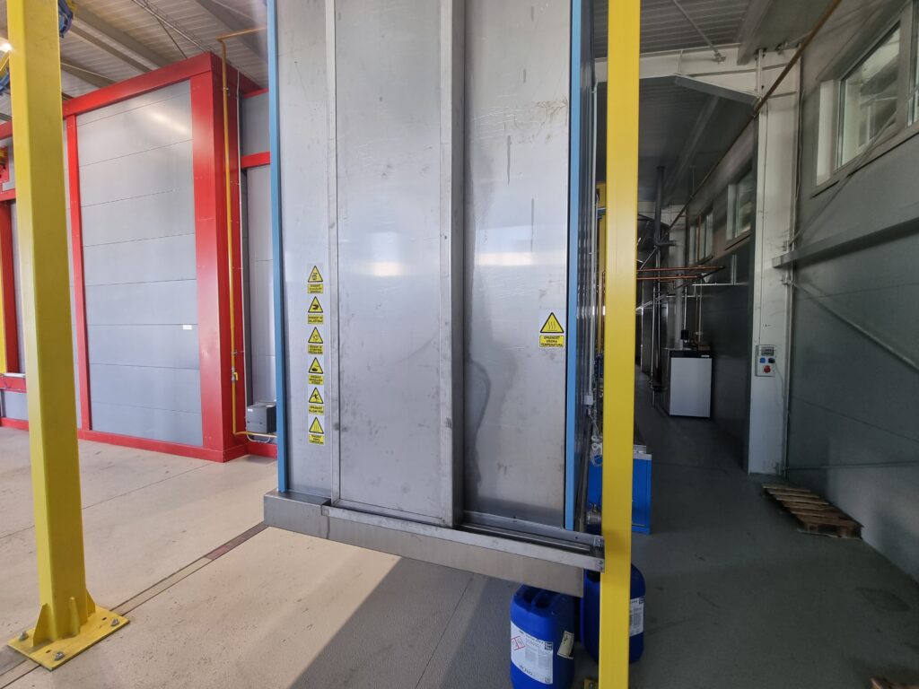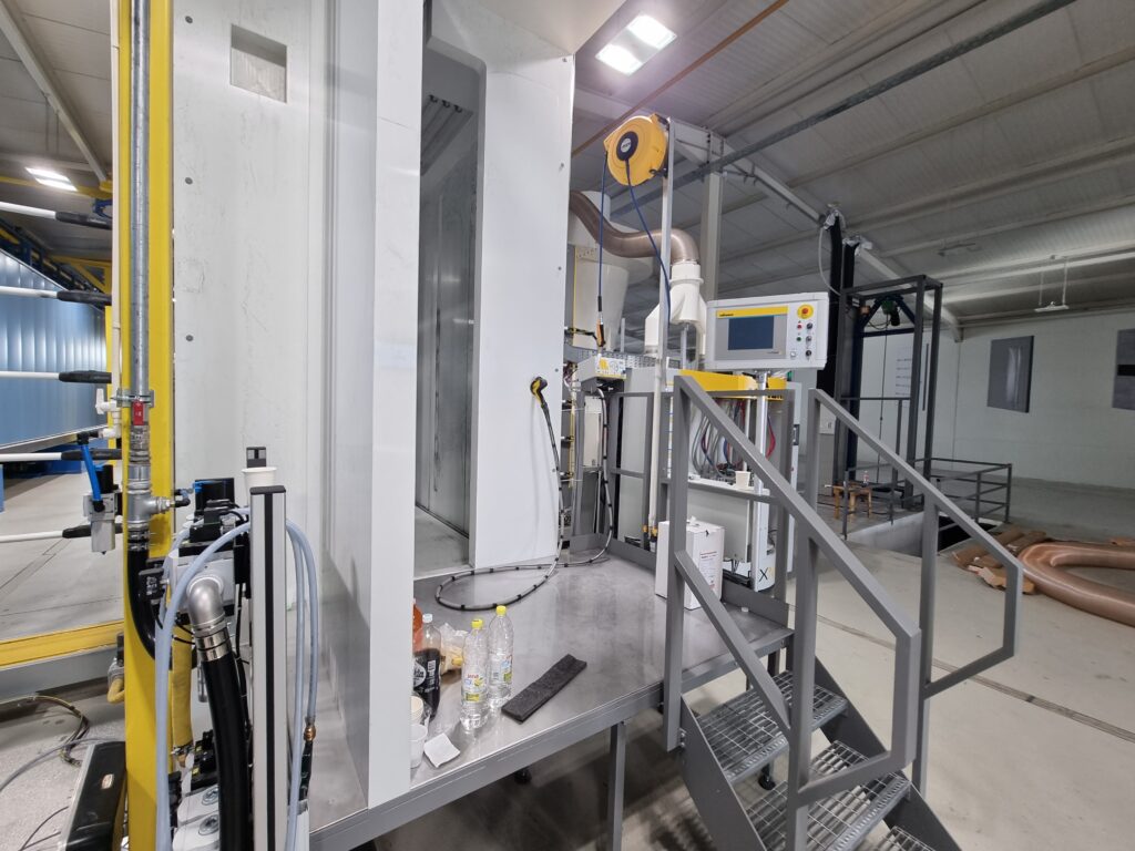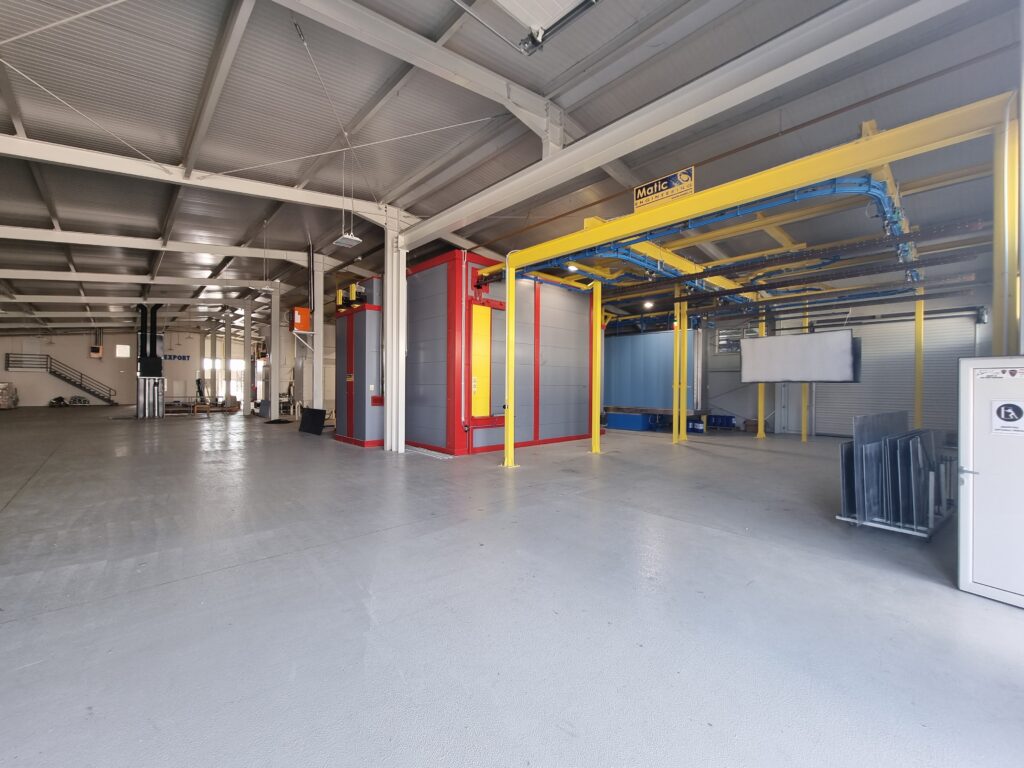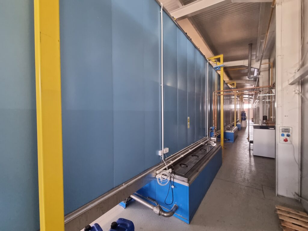 The automatic aluminum painting plant consists of the 5th chemical preparation tunnel, a dryer, a WAGNER M line cabin for powder painting, a polymerization furnace and a KEWESTA P&F conveyor that connects all these units. This plant has a capacity of 1 carrier / 5 min, which can paint more than 2000 m² of aluminum sheets in one working shift. The plastic cabin changes color up to 15 minutes, making this plant very flexible and productive.