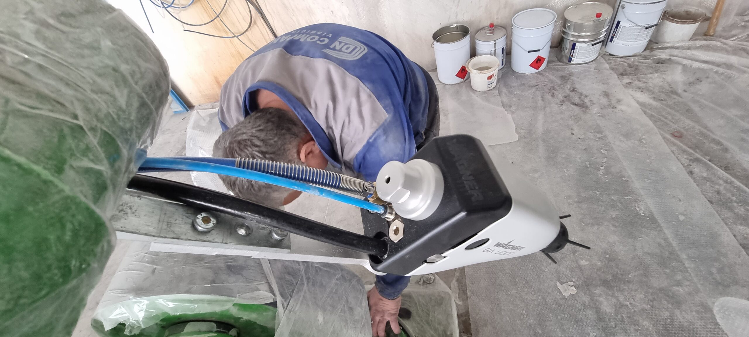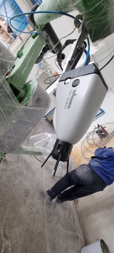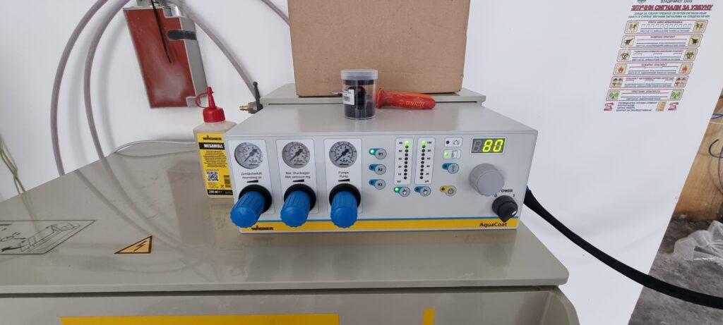 Dedicated device for water-based coatings, with application in the wood industry for surface varnishing. In cooperation with HELIOS a.d. the production in the DN Company was improved by using a device that has electric painting of liquid coatings. With this new technological venture, improvements have been achieved in terms of ecology, as well as a reduction of up to 30% in the overall consumption of paint or varnish. The specificity of this system is that the pump and the material to be applied are isolated in a plastic PP box that prevents excess voltage and current from acting on the external environment. Also the whole device is designed and certified for EX II painting zone. The GA5000EAC gun, in accordance with the high-pressure piston pump, is designed to work up to 270 bar of material pressure within the system with additional regulation of the fan on the gun with the help of compressed air. The selection of air caps and nozzles is conditioned by the workpiece, where a large range of nozzle diameters and dispersion angles makes this system flexible.