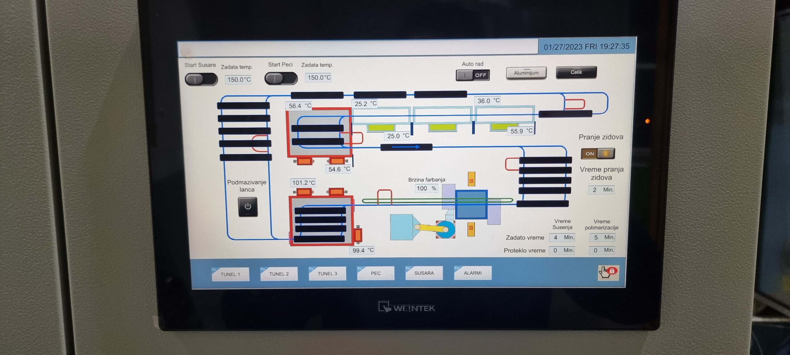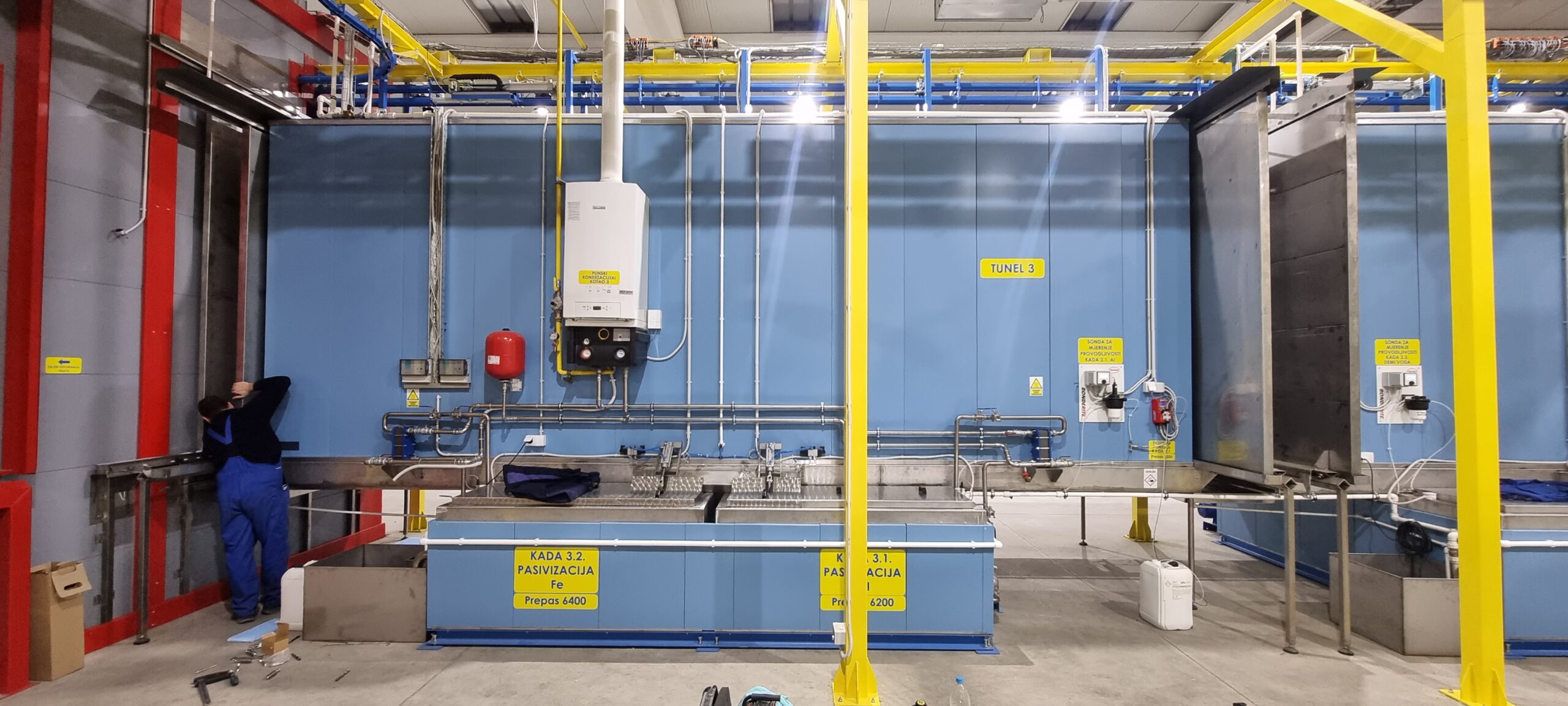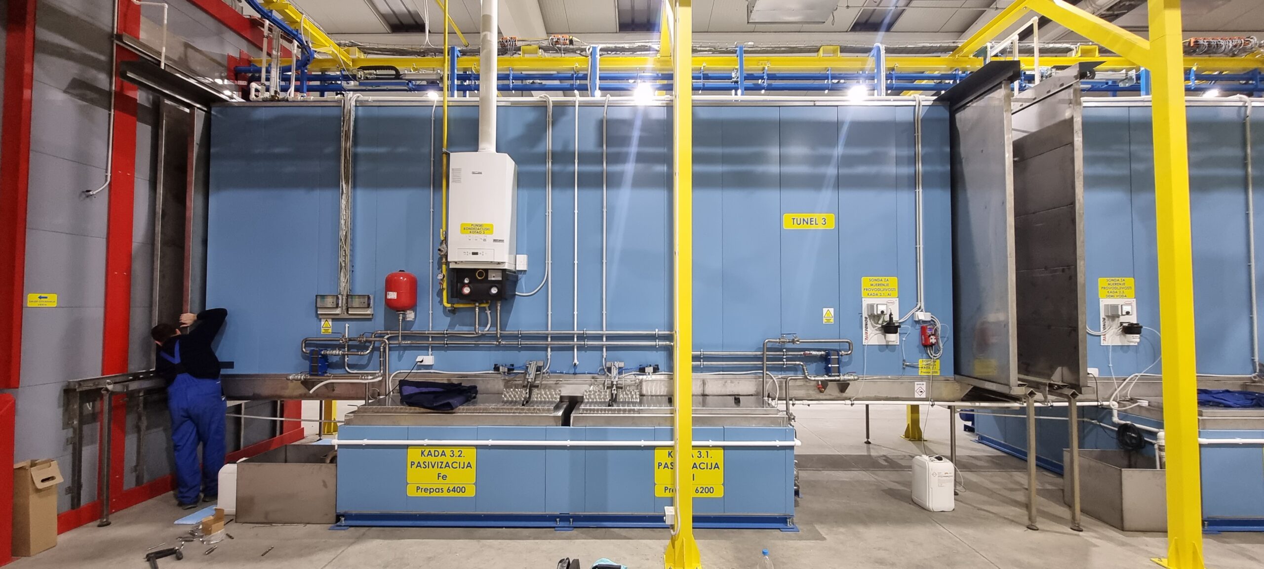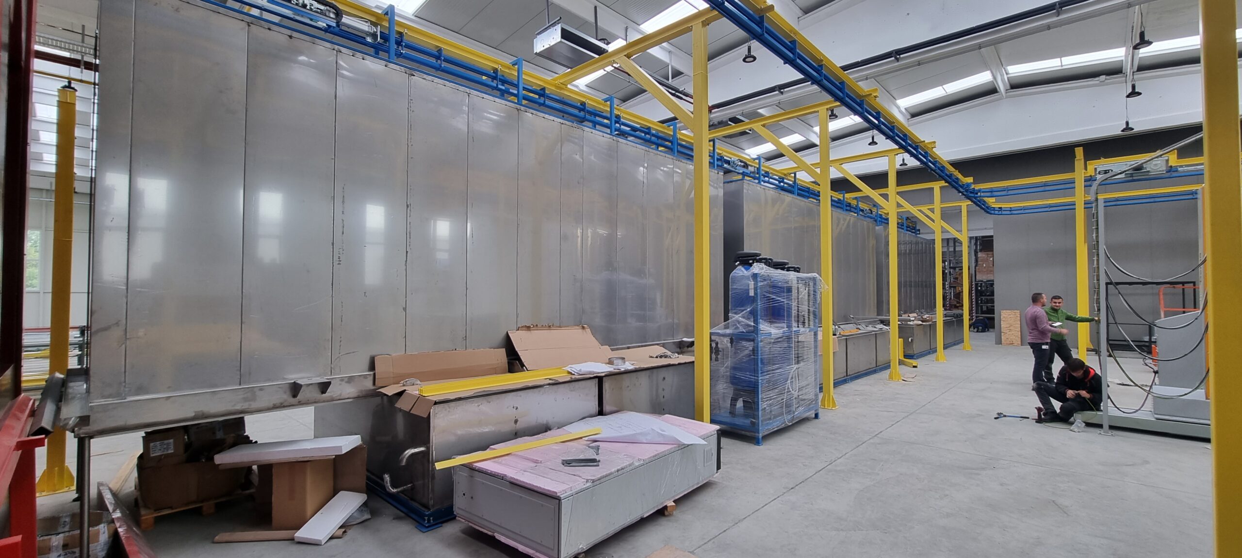 Automatsko postrojenje za farbanje praškastim premazima aluminiumskih i čeličnih proizvoda po QUALICOAT standardu.Hemijska priprema sastoji se od tri tunela koji su snabdeveni sa 9. kada različitih rastvora u postizanju adekvatne hemijske pripreme radnih površina. Sistem klapni, i automatizovanih potisnih ventila omočućava korišćenje alkalnih i fosfatnih rastvora u sistemu recirkulacije bez mešanja ovih tešnosti u njihovim početnim kadama. Sistem se upravlja preko „Touch panela“ preko kog se bira režim Čelik / Aluminium i time se određene kade koriste shodno odarbiru materijala. Automatska GEMA kabina projektovana je za maksimalnu fleksibilnost i efikasnost proizvodnog programe firme ELAS Metal Expert. Peć za polimerizaciju i sušara su projektovane shodnom ukpunom kapacitetu postrojenja od 6 – 10 min po taktu. Sve ove celine objedinjuje transportni dvošinski sistem P&F od „KEWESTE GmbH“. Tranfer lanac iznad kabine kreće se brzinom od 1.5 do 2.6 m/min u zavisnosti od kompleksnosti radnih komada. Maksimalne dimenzije komada su 6.5 x 0.8 x 2.0 m, a maksimalna nosivost po nosiljci je 300 kg. Kapacitet postrojenja je za ravne površine do 260 m2/h, ali u realnoj primeni zbog kompleksnosti prosečno je oko 150 m2/h kapacitet.